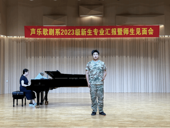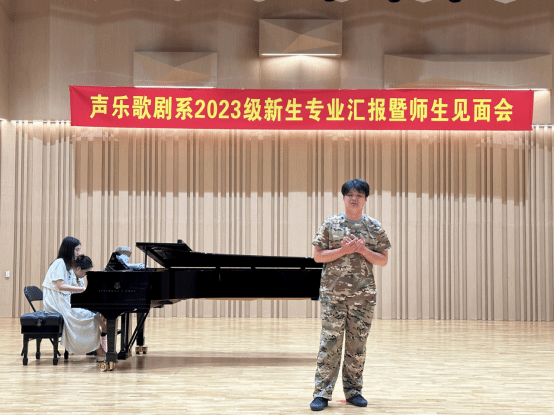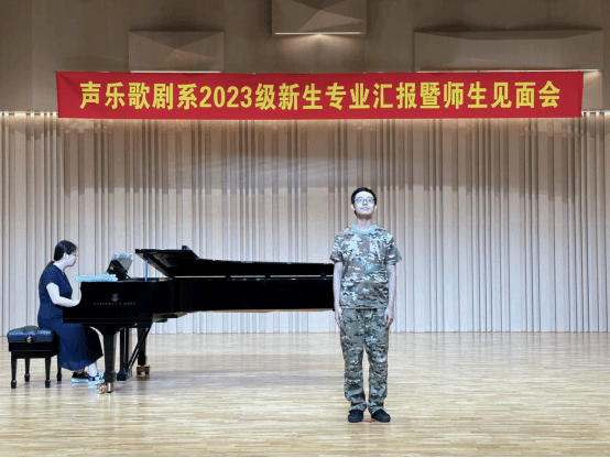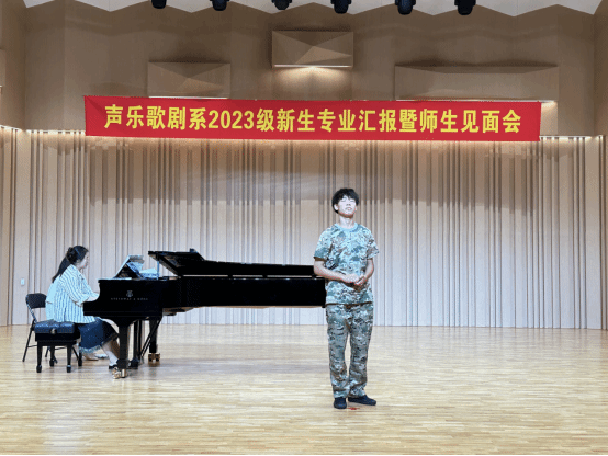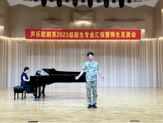 2023级音乐表演专业(声乐方向)新生专业汇报暨师生见面会,于2023年9月15日下午17:00在音乐厅举行。本次汇报由声歌系姜莎老师主持,全体专任教师参加。本次共109名同学进行专业汇报,在汇报前,声乐歌剧系主任郭艳艳、教师代表靳菲分别进行了讲话,对2023级新同学的到来表示热烈的欢迎并给予最大的期许。