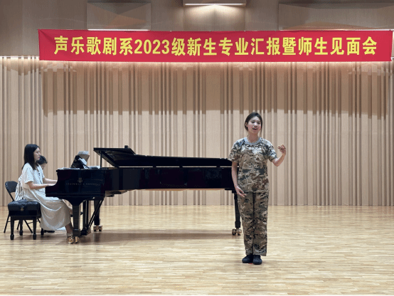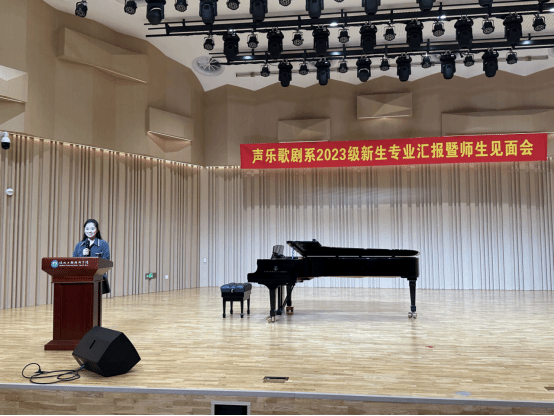 2023级音乐表演专业(声乐方向)新生专业汇报暨师生见面会,于2023年9月15日下午17:00在音乐厅举行。本次汇报由声歌系姜莎老师主持,全体专任教师参加。本次共109名同学进行专业汇报,在汇报前,声乐歌剧系主任郭艳艳、教师代表靳菲分别进行了讲话,对2023级新同学的到来表示热烈的欢迎并给予最大的期许。
